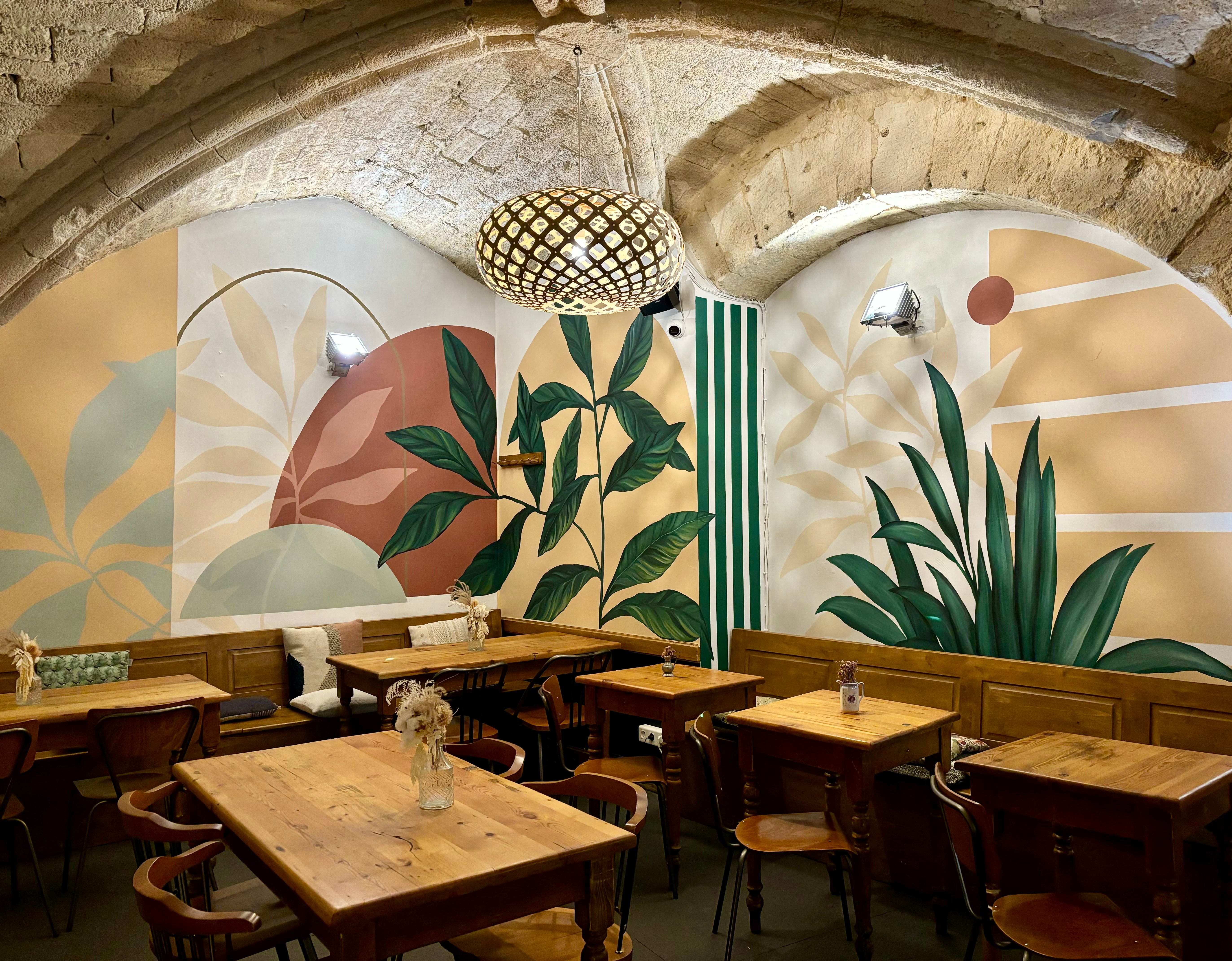 Pour le restaurant Ma Première Cantine, j'ai eu l'honneur de réaliser une fresque murale qui illumine l'espace avec des formes végétales et géométriques. Utilisant des couleurs naturelles, cette œuvre s'intègre harmonieusement dans une salle voûtée en pierre, créant un contraste chaleureux et apaisant.